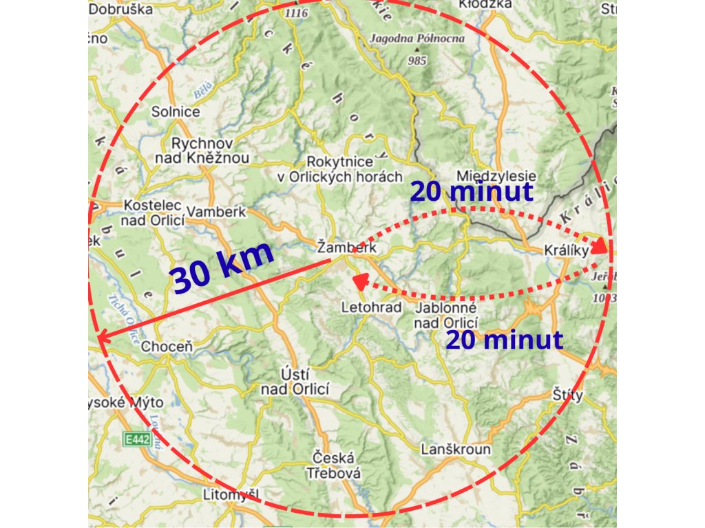 Časový interval 40 minut Vám umožní přelétnout masiv Suchého vrchu a podívat se dál na městečko Králíky, nad kterým se rozkládá areál kláštera Hora Matky Boží Hedeč nad kterým zakroužíte a prohlédnete si jeho krásné barokní tvary. Cestou spatříte třeba oblíbenou turistickou chatu Na Adamu a Pastvinskou přehradu. Opačným směrem se milovníci zámků jistě rádi proletí nad Častolovickým zámkem s jeho krásným parkem a pak budou pokračovat nad Rychnov nad Kněžnou, jehož zámecký areál dominuje celému městu. A co teprve Orlické hory! Vydejte se nad Zakletý vrch a pokračujte dále ke Kunštátské kapli a Velké Deštné!